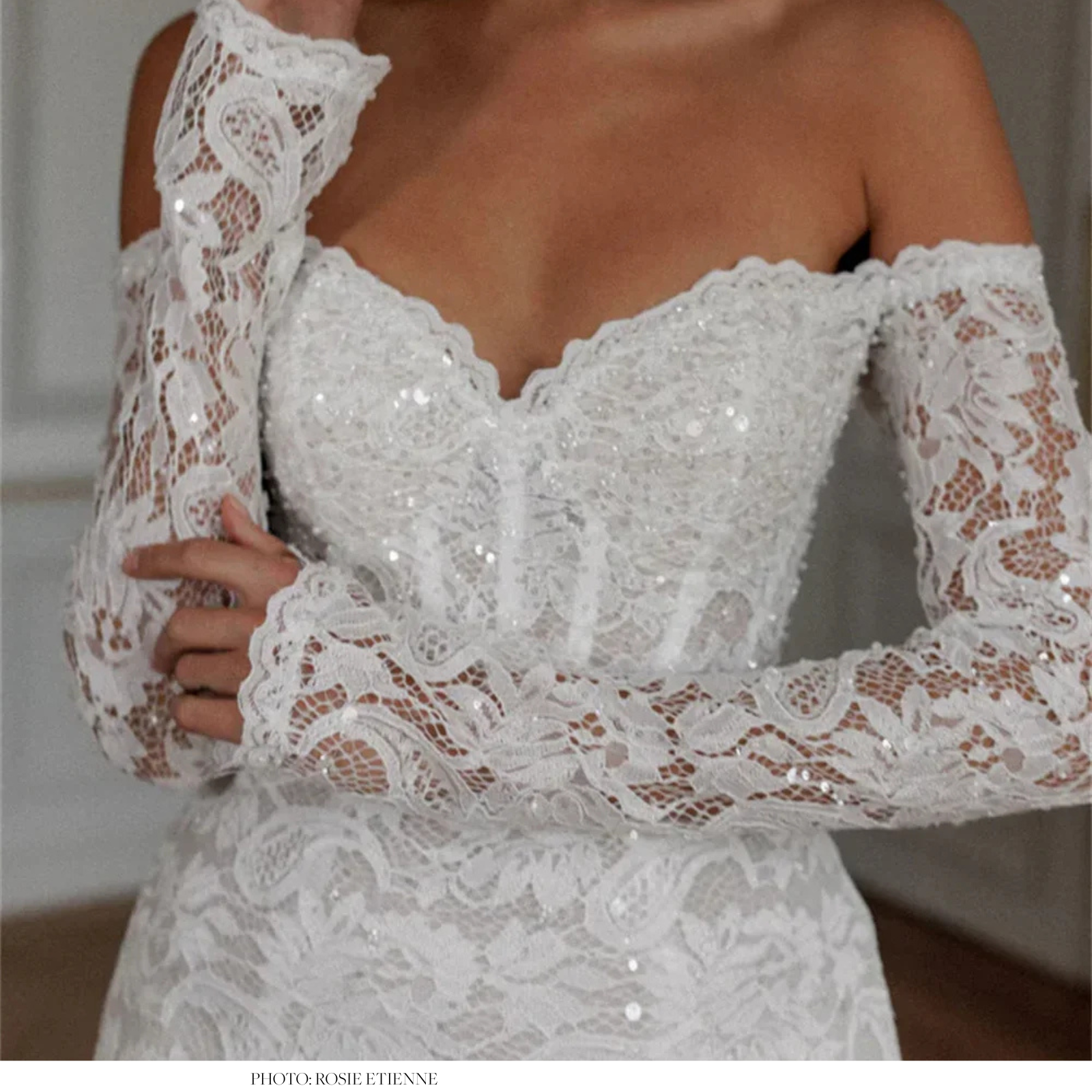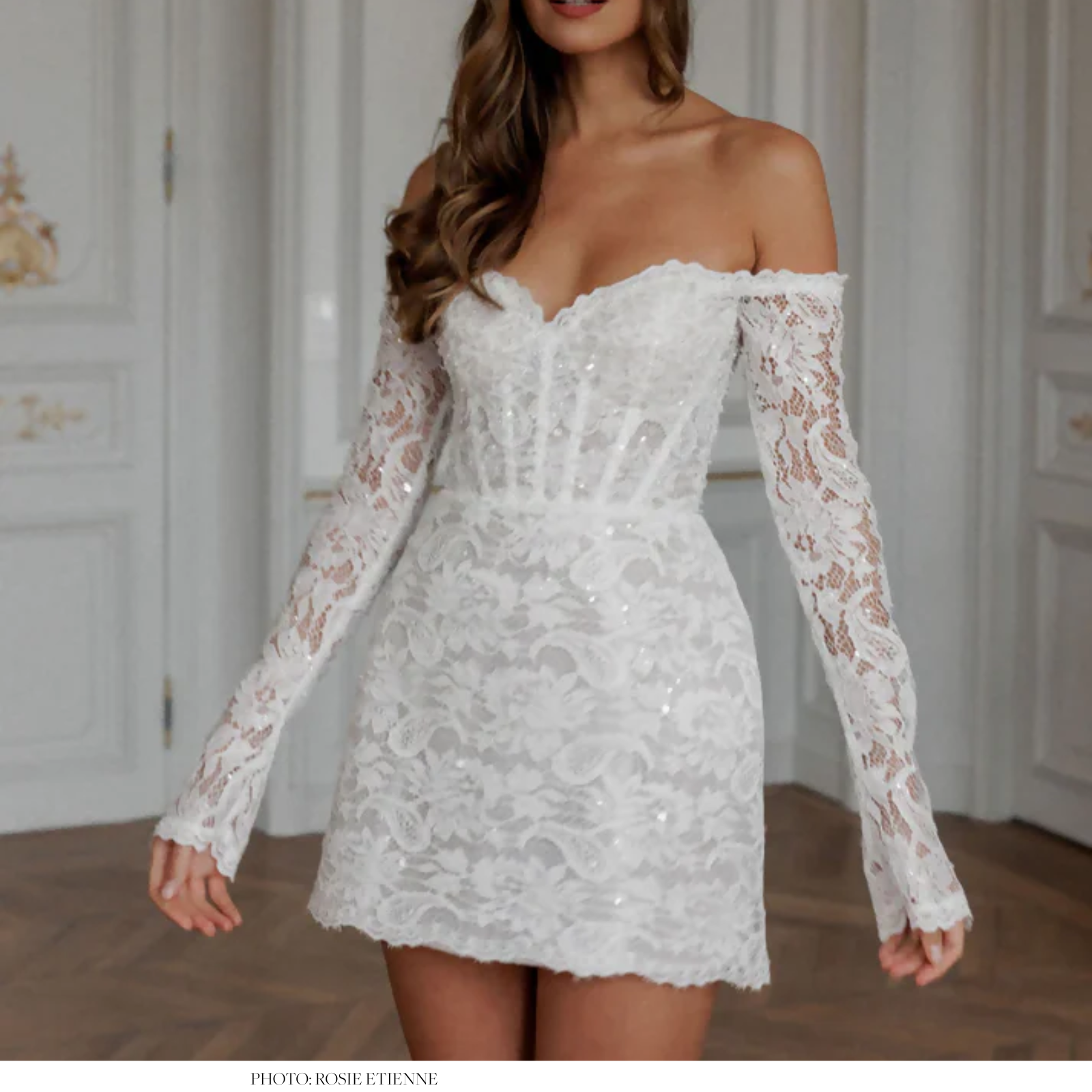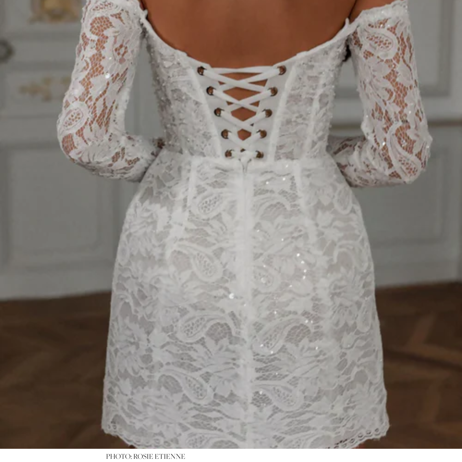 Amelie exudes understated charm and beauty. This A-line mini dress, graced with beautifully embroidered lace and subtle beading, is tailored with structural boning for a sculpted fit. Amelie embodies pure sophistication and grace, making it the ideal choice for the modern bride.